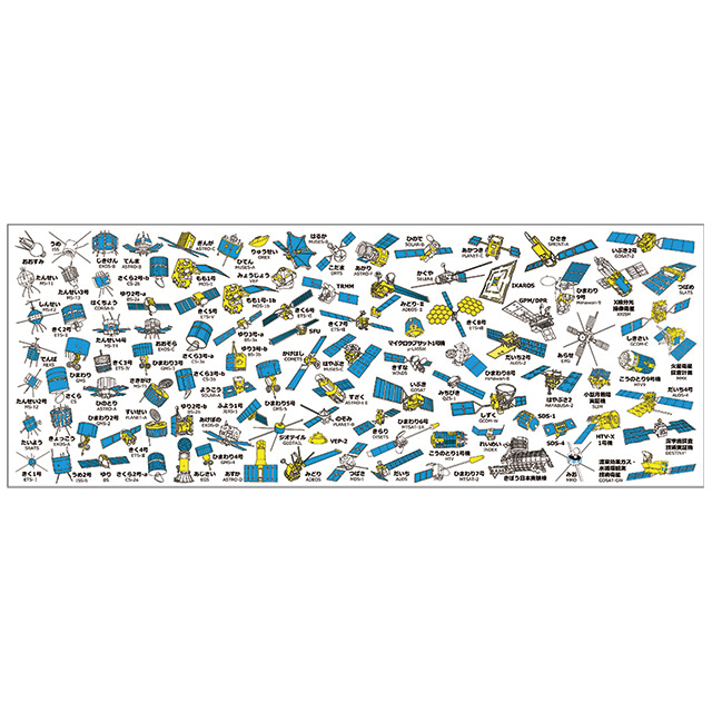 日本初の人工衛星「おおすみ」から前回の「線観測天文衛星「ひとみ」(ASTRO-H)」に加えて、今回のモデルから「MMX、こうのとり9号機、HTV-X、だいち4号、GOSAT-GW」が追加!全て合わせて100機以上の衛星が描かれています。